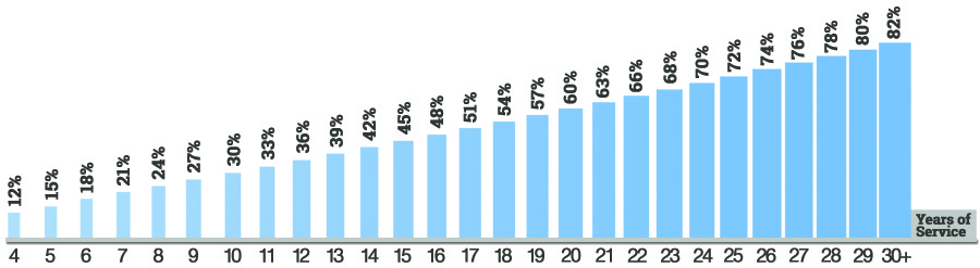 To find the basic benefit multiplier percentage, locate the number of years served on the chart. The corresponding percentage is the multiplier percentage used in the calculation above.